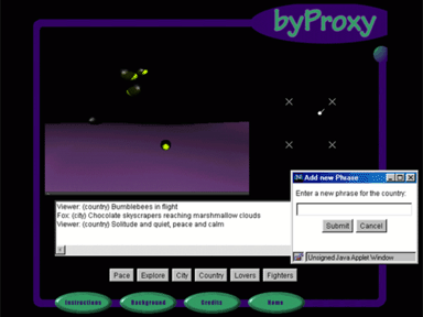 Commissioned by New Radio and Performing Arts, Inc. for the turbulence.org web site, byProxy explored issues of communication speed vs. accuracy. In this work, viewers used a virtual 3D environment to determine what was said on their behalf into a chat room. The viewer could add one phrase to the vocabulary of each “proxy”, thus influencing the speech but not specifically determining what was said.
